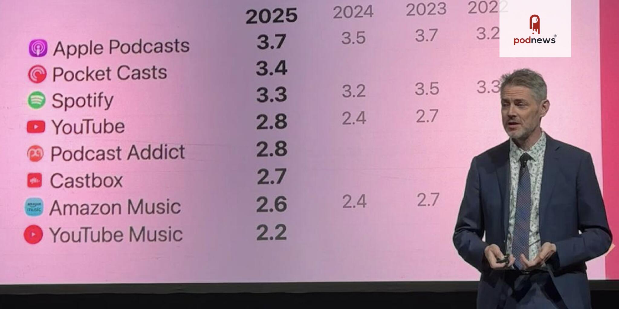 npub1hmse...7fpv 8 months ago Nice to see #PocketCasts beat out Spotify for 2nd favorite podcasting app. PodnewsThe Podnews Report Card 2025 ResultsThe full results from the Podnews Report Card 2025 - with scores and comments Need to get @npub1xwpe...m2fz up there soon. Right @npub1thg9...zq23