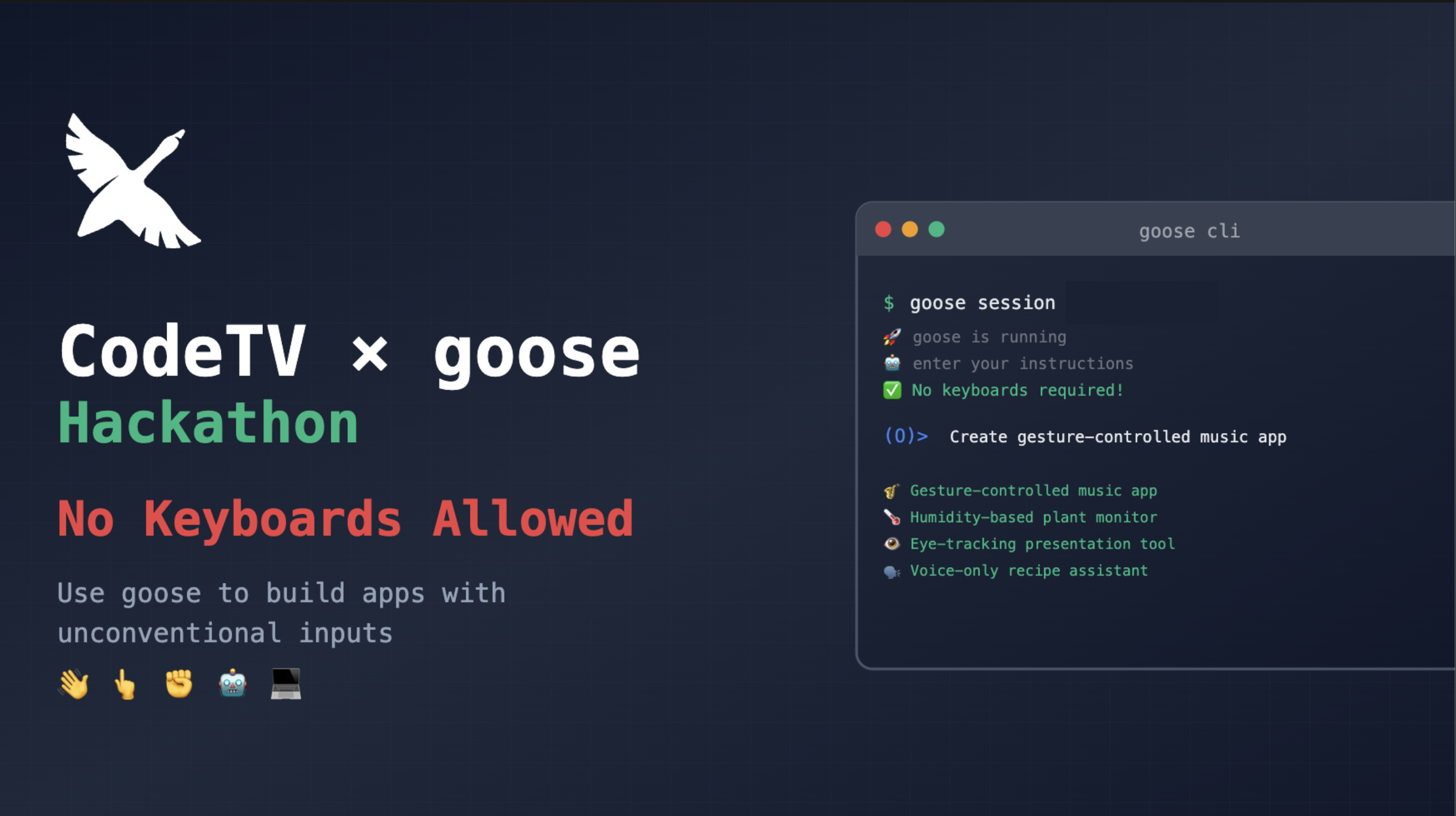 Use goose to create an app driven by voice, vision, or motion β anything but your keyboard.