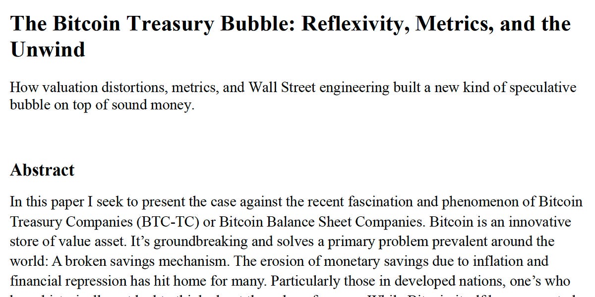 Fiat-🧠 & high time preference are back in play. The Bitcoin Treasury 🫧: ✅Equity-funded BTC flywheels. 🏁Securitized hype. 💸mNAV mania. BTC is sound money. BTC-TCs are a risk wrapper, a speculative attack. The Bitcoin Treasury Bubble: Reflexivity, Metrics, & the Coming Unwind 👇 Read + Download: 🔗 image