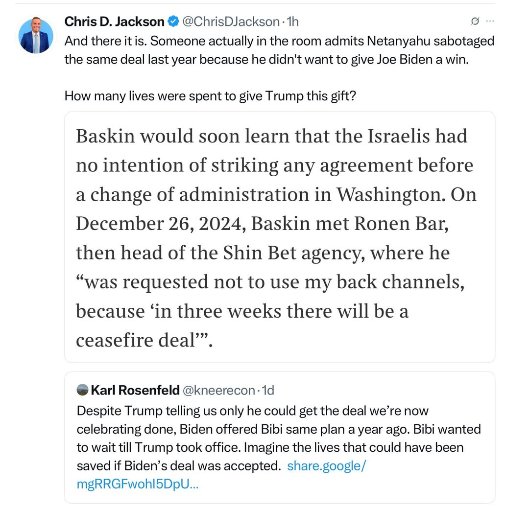 Denise Wheeler 2 months ago Trump didn't end the war in Gaza. Gaza was obliterated by Israel. The war was already over. Bibi the Butcher just gave Trump the credit. https://scarletina.us-east.host.bsky.network/xrpc/com.atproto.sync.getBlob?did=did:plc:f7utvjkqbgwfjonqtpfcf5fu&cid=bafkreihy5p6pv7aoadsl2ow6qfb6e5nccxc7xxlr3ubyxbieoavrnfhe5q