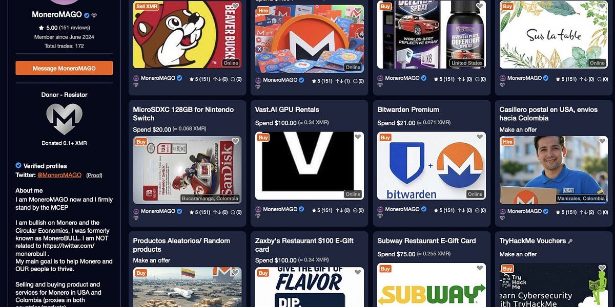 MoneroMAGO: one of our earliest, most active/successful sellers with 172 successful trades and 151 five-star reviews, many from established (not throwaway) accounts.
