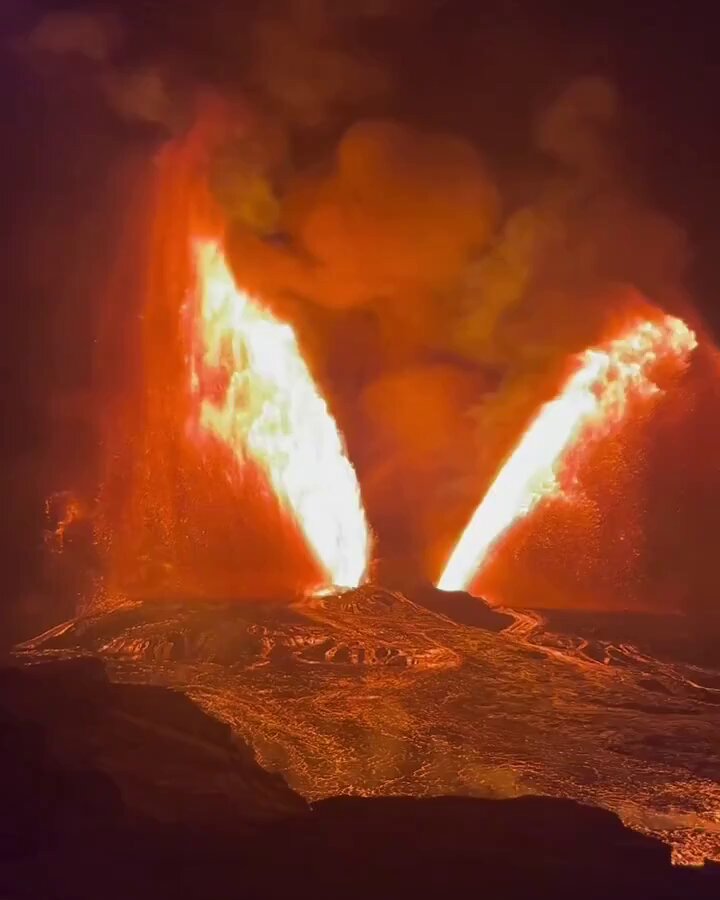 β‘οΈπ WATCH - Kilauea volcano in Hawaii erupts, producing a striking wing-shaped burst of activity with lava fountains climbing over 1,500 feet high