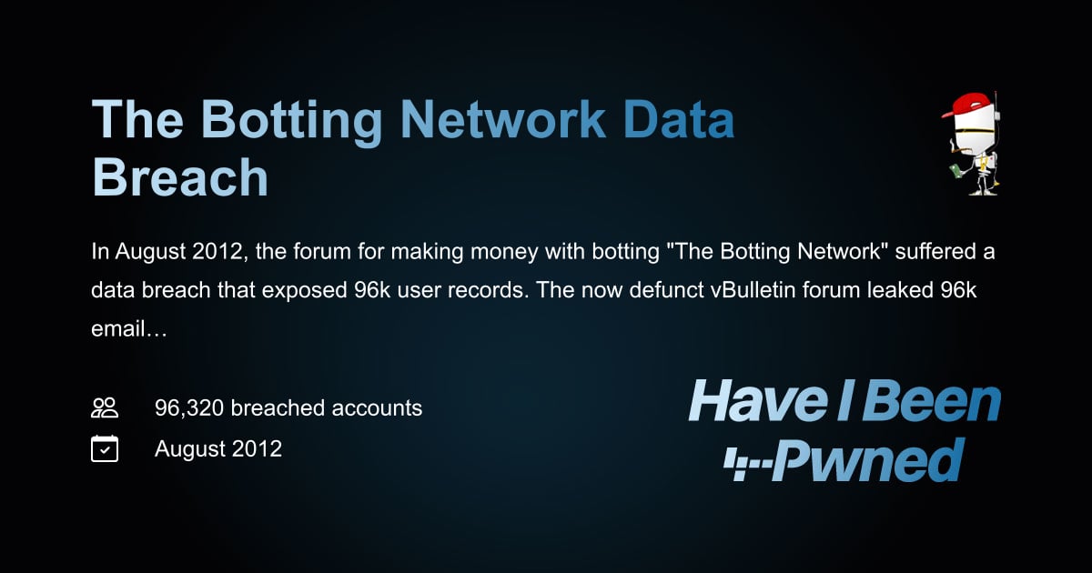 New breach: Now defunct forum for making money with botting "The Botting Network" was breached in 2012, exposing 96k records. Data included email address, username, DoB and salted MD5 password hashes. 97% were already in @npub1rqsm...83hv. Read more: