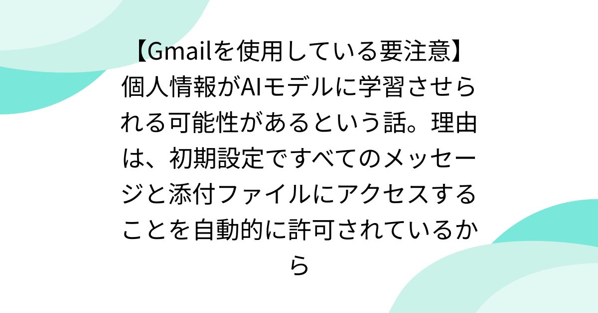 【Gmailを使用している要注意】個人情報がAIモデルに学習させられる可能性があるという話。理由は、初期設定ですべてのメッセージと添付ファイルにアクセスすることを自動的に許可されているから - posfie Gmailの個人情報がAIモデルに学習される可能性についての記事です。 初期設定で全てのメッセージと添付ファイルへのアクセスが許可されているためです。 注意喚起と対策の必要性を述べています。