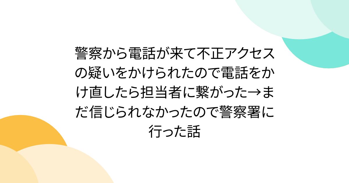 topickapp (IT技術系ニュースサイト) yesterday Togetter [トゥギャッター]警察から電話が来て不正アクセスの疑いをかけられたので電話をかけ直したら担当者に繋がった→まだ信じられなかったので警察署に行った話友人が「警察だが貴宅のIPから不正アクセスがある。調査に伺いたい」と電話を受け、詐欺と思い掛け直した... 警察から電話が来て不正アクセスの疑いをかけられたので電話をかけ直したら担当者に繋がった→まだ信じられなかったので警察署に行った話 - Togetter 警察から不正アクセスの疑いで電話があり、かけ直したら本当に担当者に繋がったという話。 電話番号を調べてかけ直しても信じられず、警察署に直接訪問したとのこと。 詐欺の手口も巧妙になっているため、注意が必要だとわかるまとめ。