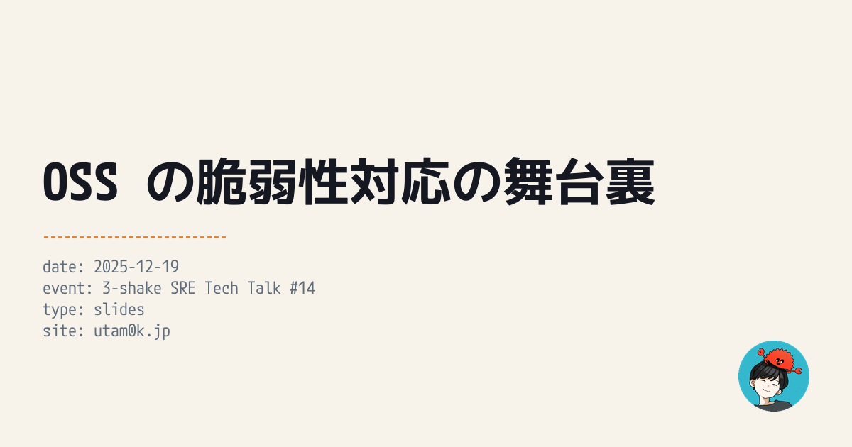 topickapp (IT技術系ニュースサイト) yesterday うたもくOSS の脆弱性対応の舞台裏3-shake SRE Tech Talk #14 登壇資料 OSS の脆弱性対応の舞台裏 | Slides | うたもく GitHubでホストされるOSSの脆弱性対応について解説されています。 報告から公開までの流れや、非公開修正の進め方を紹介。 3-shake SRE Tech Talk #14 オンサイトでの発表資料です。