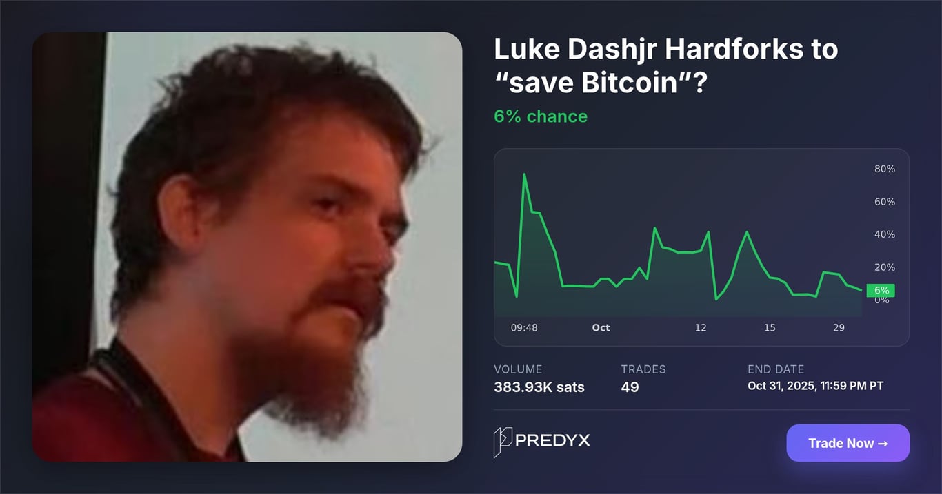 Dave🐸 2 months ago PREDYX: Luke Dashjr Hardforks to “save Bitcoin”? Predyx | Advanced Prediction Markets with Lightning NetworkLuke Dashjr Hardforks to “save Bitcoin”?This market resolves “Yes” if, by October 31, 2025, 11:59 PM PT, Luke Dashjr (personally or via a project he leads, e.g., Bitcoin Knots or OCEA...