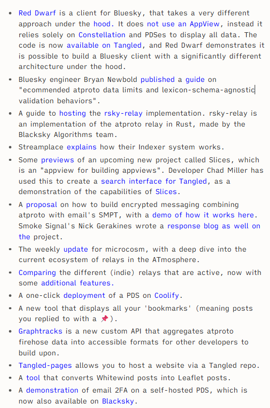 Every time I hear about how the ATmosphere isn't decentralized enough... and then I see things like Laurens' regular newsletter showing how much non-Bluesky PBC development of incredibly cool stuff is happening... (this is just a snippet, full newsletter has more):