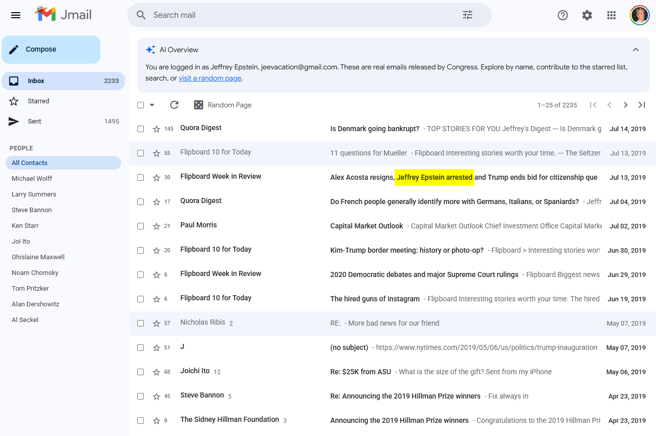 Using Jmail, you can read thousands of Jeffrey Epstein's emails in a familiar format. Use the star function to highlight notable finds.