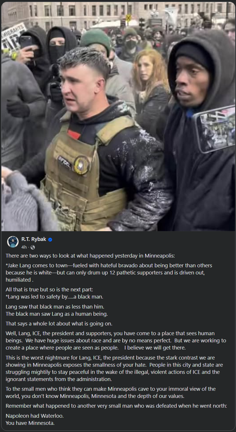 RE: From R.T. Rybak - Minneapolis Mayor - from 2002 to 2014 "There are two ways to look at what happened yesterday in Minneapolis: 🔸Jake Lang comes to town—fueled with hateful bravado about being better than others because he is white—but can only drum up 12 pathetic supporters and is driven out, humiliated . All that is true but so is the next part: 🔸Lang was led to safety by…..a black man. Lang saw that black man as less than him. The black man saw Lang as a human being. That says a whole lot about what is going on. Well, Lang, ICE, the president and supporters, 💥you have come to a place that sees human beings. We have huge issues about race and are by no means perfect. But we are working to create a place where people are seen as people. I believe we will get there. This is the worst nightmare for Lang, ICE, the president ⭐️because the stark contrast we are showing in Minneapolis exposes the smallness of your hate. 🔥People in this city and state are struggling mightily to stay peaceful in the wake of the illegal, violent actions of ICE and the ignorant statements from the administration. To the small men who think they can make Minneapolis cave to your immoral view of the world, you don’t know Minneapolis, Minnesota and the depth of our values. Remember what happened to another very small man who was defeated when he went north: Napoleon had Waterloo. You have Minnesota." View quoted note →