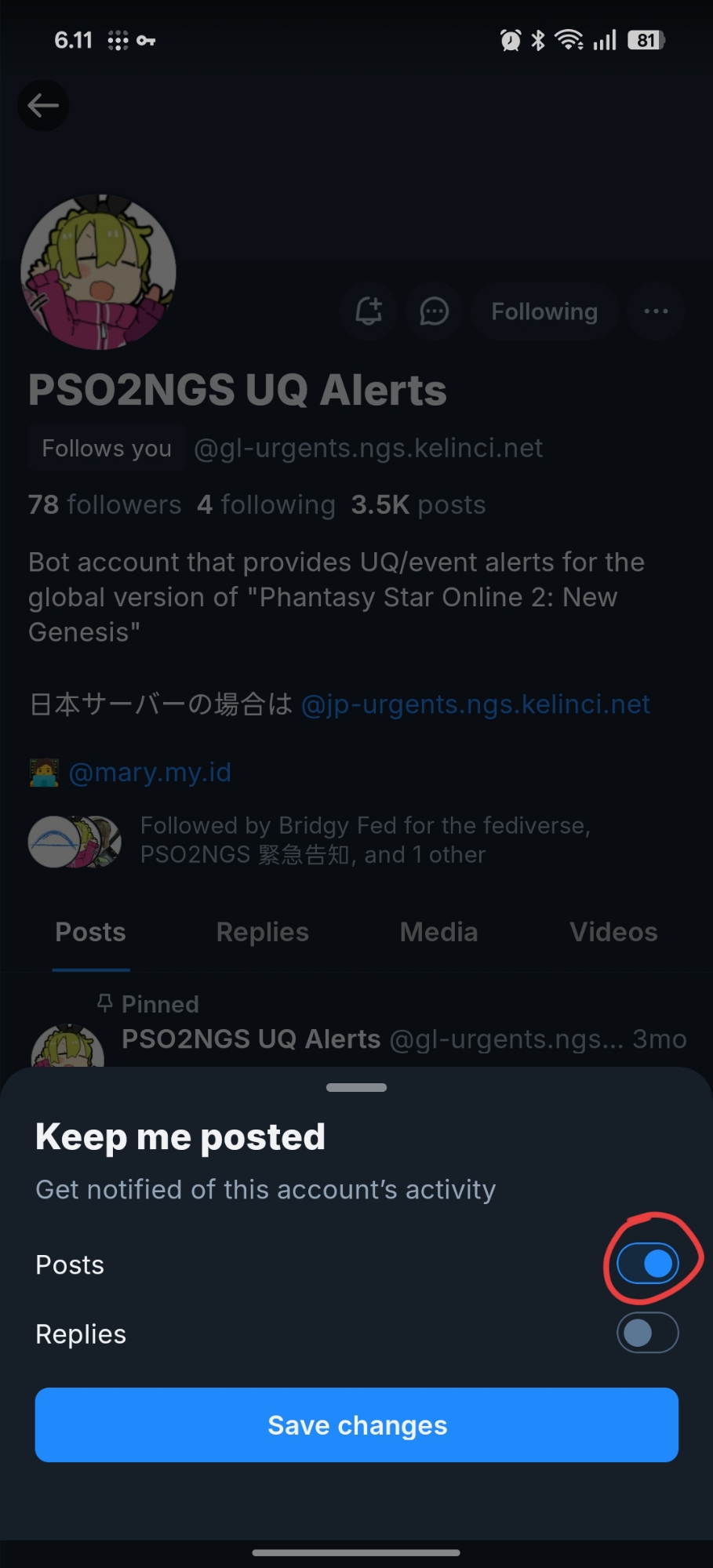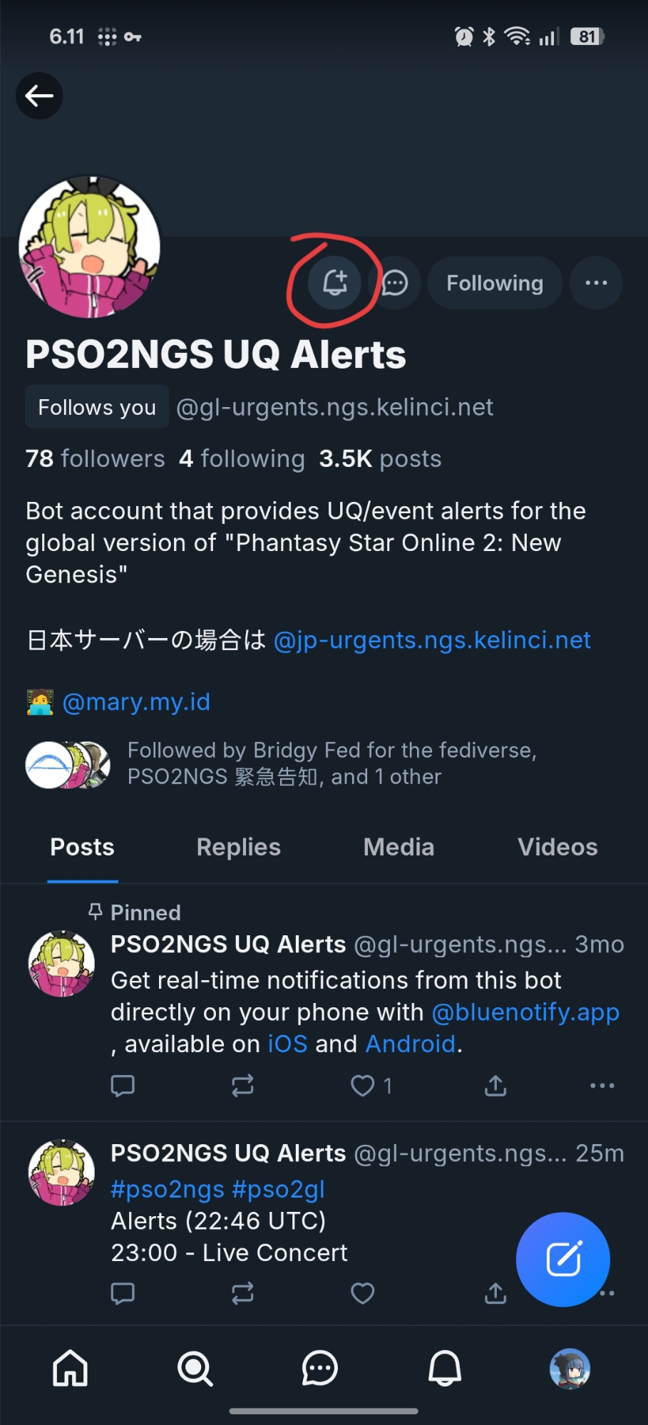 Bot account that provides UQ/event alerts for the global version of "Phantasy Star Online 2: New Genesis"
