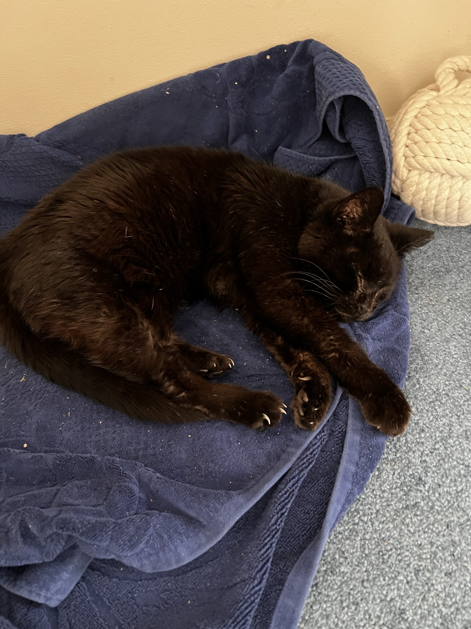 Midnight cat has started sleeping on the towel that was down for snowy boots. Sometimes amidst the boots. Sometimes sprawled like this: