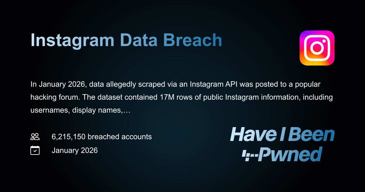 In January 2026, data allegedly scraped via an Instagram API was posted to a popular hacking forum. The dataset contained 17M rows of public Instag...
