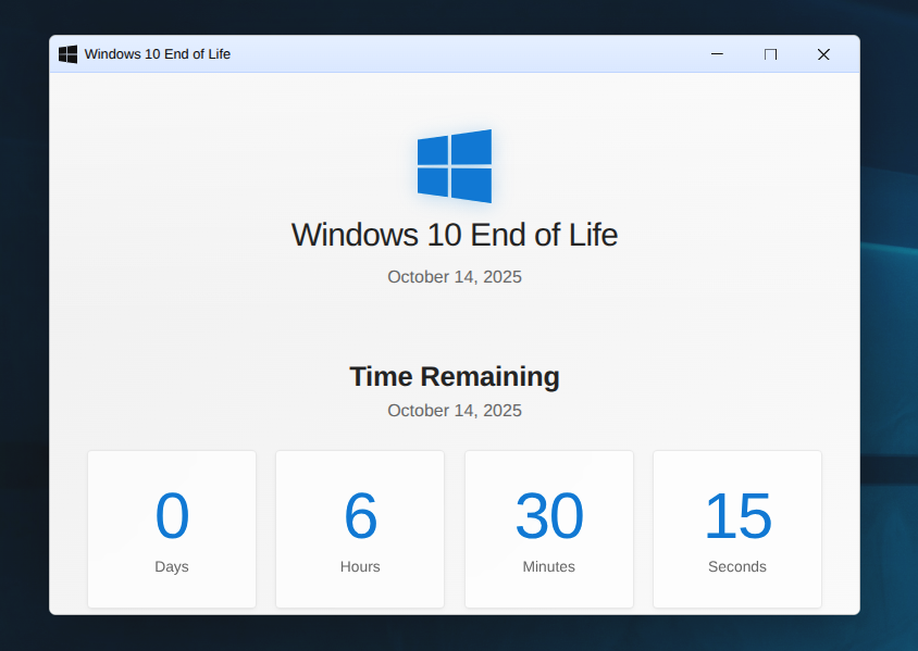 jack 3 months ago RIP Windows 10, you'll be missed Vibe coded this web app for you to count down the time until Windows 10's death... π [win10-eol.pages.dev](Windows 10 End of LifeCountdown to Windows 10 end of support on October 14, 2025. ) [Windows 10 End of Life](Windows 10 End of LifeCountdown to Windows 10 end of support on October 14, 2025. )