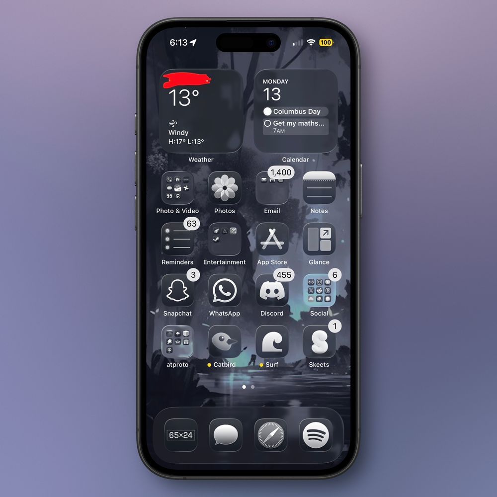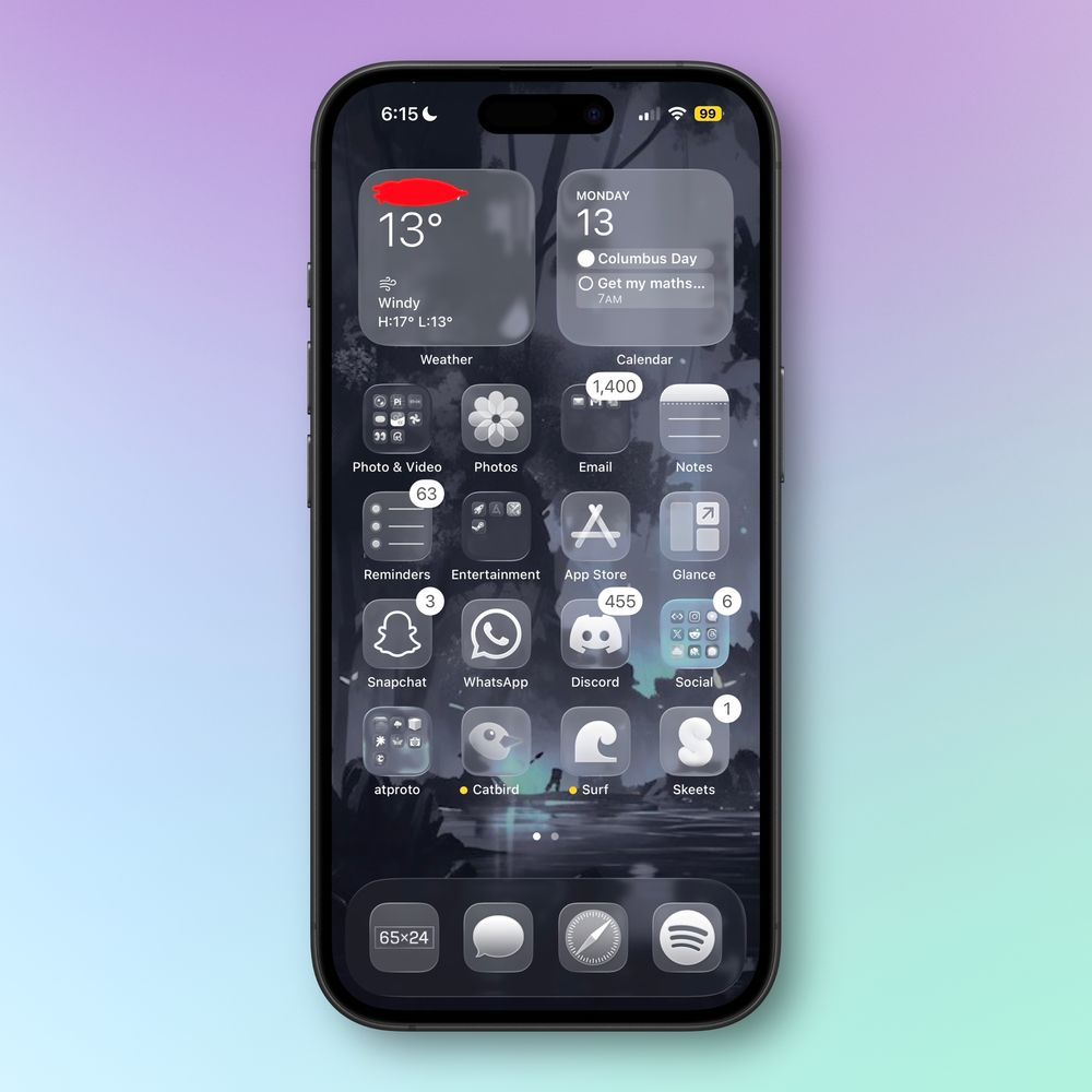 jack 3 months ago Itβs been around 1 month since the launch of #iOS26! Do you use the glass icons or tinted? On mine I use the tinted app icons (1st screenie) for this wallpaper, clear feels too pale: https://pds.j4ck.xyz/xrpc/com.atproto.sync.getBlob?did=did:plc:4hawmtgzjx3vclfyphbhfn7v&cid=bafkreihoo7dknezj4mxqjabrny3jnkjhhdxolckc2ijmjd4rjgpxekgq6a https://pds.j4ck.xyz/xrpc/com.atproto.sync.getBlob?did=did:plc:4hawmtgzjx3vclfyphbhfn7v&cid=bafkreig74wjdsj5de4yqbknwk7pao6sbskt4c6qm7r5d4bcuw3urfwwrwu