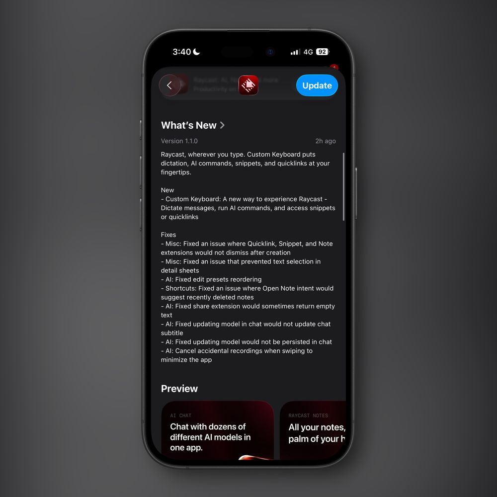 jack 3 months ago The new Raycast iOS update adds an iOS keyboard with access to Snippets, AI commands + more! Pretty cool way to bypass iOSβ locked down nature. Quite a lot of things can be done with this Iβm sure! https://pds.j4ck.xyz/xrpc/com.atproto.sync.getBlob?did=did:plc:4hawmtgzjx3vclfyphbhfn7v&cid=bafkreihhnjlrgph45bhhmzowma6mknvc2otgenatsnxytinrwhrasyohyy https://pds.j4ck.xyz/xrpc/com.atproto.sync.getBlob?did=did:plc:4hawmtgzjx3vclfyphbhfn7v&cid=bafkreih6p4q6zusbcvnxicmotvlzxcwyofryughx3i5j5lgfqwapkpsjga https://pds.j4ck.xyz/xrpc/com.atproto.sync.getBlob?did=did:plc:4hawmtgzjx3vclfyphbhfn7v&cid=bafkreigbjntqlg6cmj4hwx6bzf4qy7sctrpzs7quw2c3tasitvf27nogji