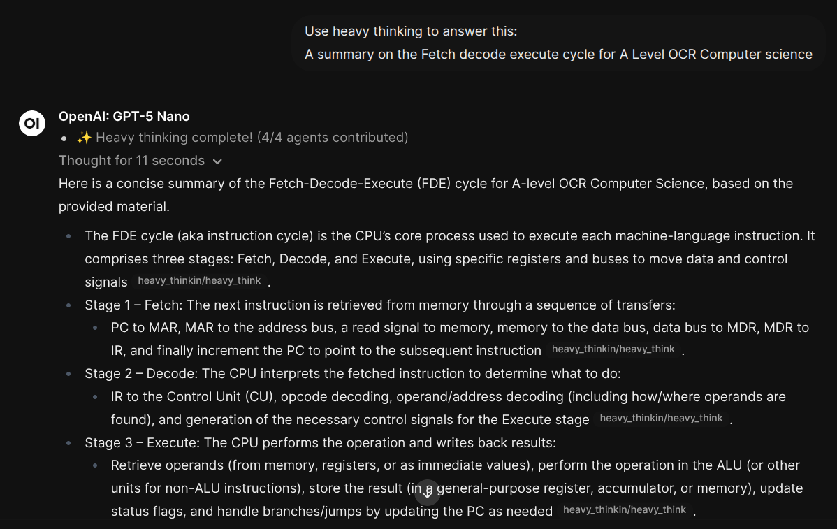 jack 3 months ago Got a little distracted whilst trying to study... and ended up vibe coding this OpenWebUI compatible tool that lets you use a "Heavy thinking" mode inspired by Grok's "Heavy" mode which lets multiple agents think about a question. Open source on GitHub and works pretty well from my experience! https://pds.j4ck.xyz/xrpc/com.atproto.sync.getBlob?did=did:plc:4hawmtgzjx3vclfyphbhfn7v&cid=bafkreihncw77k5vcbhpn2kkepabveat4u423xd7kzx2vf24djwcfidyo2m