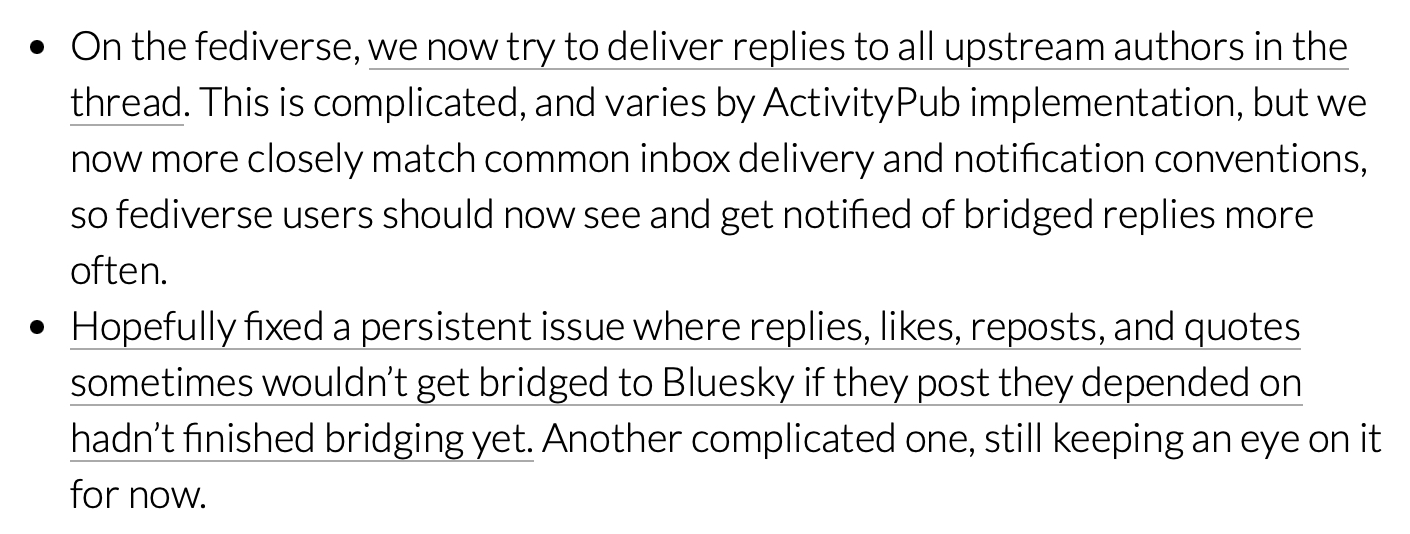 Kuba Suder π΅π±πΊπ¦ 5 months ago Yess thank you! π This should hopefully made bridging threads with back-and-forth between B/M accounts more reliable π RE: Bluesky SocialBridgy Fed for the fediverse (@ap.brid.gy)New status update! We have big projects and features cooking, but thereβs still lots of good stuff in here: broader fediverse delivery, fix for r... https://lab.martianbase.net/xrpc/com.atproto.sync.getBlob?did=did:plc:oio4hkxaop4ao4wz2pp3f4cr&cid=bafkreibdxn2yn33z7jnpdod7xetcufncwfgixlsui7rv7vasr7skequede