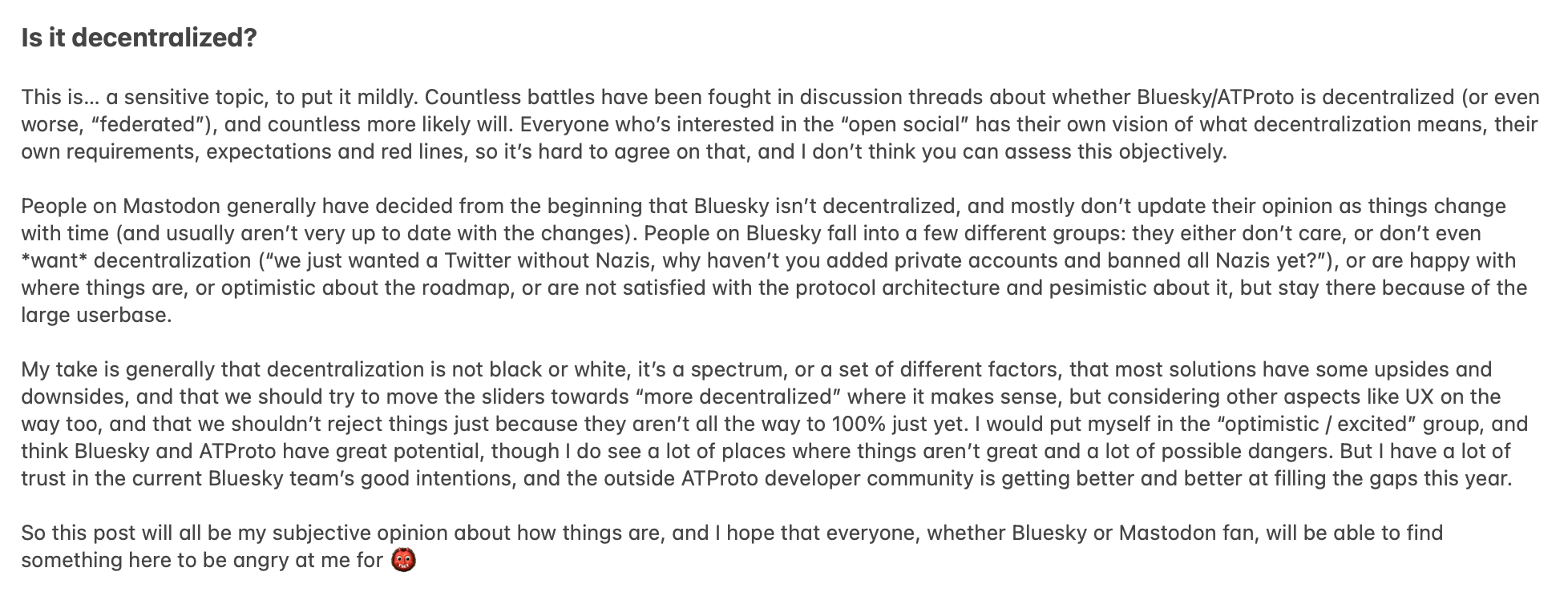 Kuba Suder π΅π±πΊπ¦ 5 months ago I think if we get to the "important accounts are fairly well distributed" phase, that could actually be "sufficiently decentralized" RE: Bluesky Socialbryan newbold (@bnewbold.net)my prediction is that Bluesky will remain a popular choice for casual users, and have a large fraction of users by count. but folks that care wil...