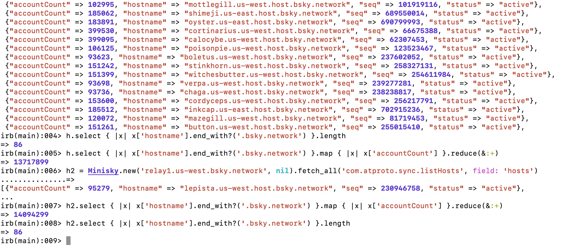 Kuba Suder π΅π±πΊπ¦ 3 months ago @npub12elz...lrpy do you have an idea why listsHosts on the sync 1.1 test relays returns suspiciously small accountCount numbers for the πβπ«π? Like, some are <100k, and I think there should be like ~500k accounts on each? They add up to 13.7-14.1M total (different on west/east) vs. expected ~40Mβ¦ π€ https://lab.martianbase.net/xrpc/com.atproto.sync.getBlob?did=did:plc:oio4hkxaop4ao4wz2pp3f4cr&cid=bafkreiafzjymydg7yjxr5xuvjuq5gqcca7x4fxix2h6ssl6eueepkhxbs4