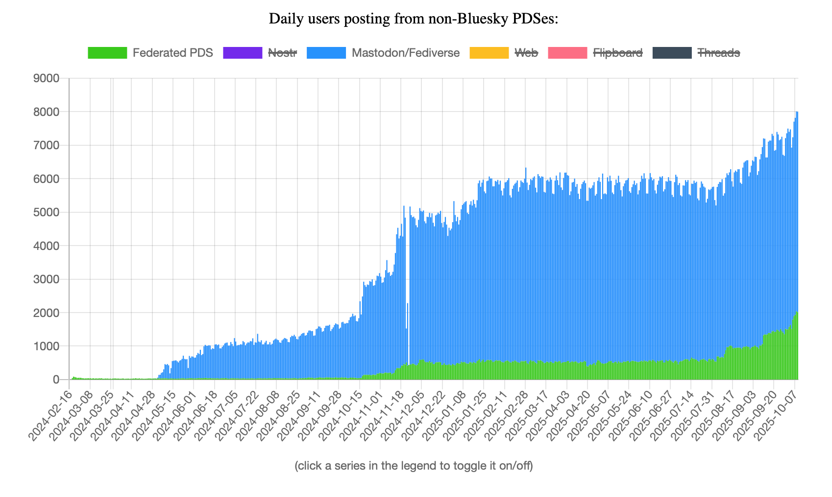 Kuba Suder π΅π±πΊπ¦ 3 months ago Interestingβ¦ so the Bridgy PDS is huge in terms of total accounts (like 10x all self-hosted), but in terms of *active* accounts (DAU etc.), the number of users bridged from Mastodon is only 3x more π§ Which means the green can realistically overtake the blue here in the coming monthsβ¦ #BlueskyStats https://lab.martianbase.net/xrpc/com.atproto.sync.getBlob?did=did:plc:oio4hkxaop4ao4wz2pp3f4cr&cid=bafkreifhaoo7afthlvoxaxacgdpxmhv2bjhnzwpeiathriotxdxcwrhgla