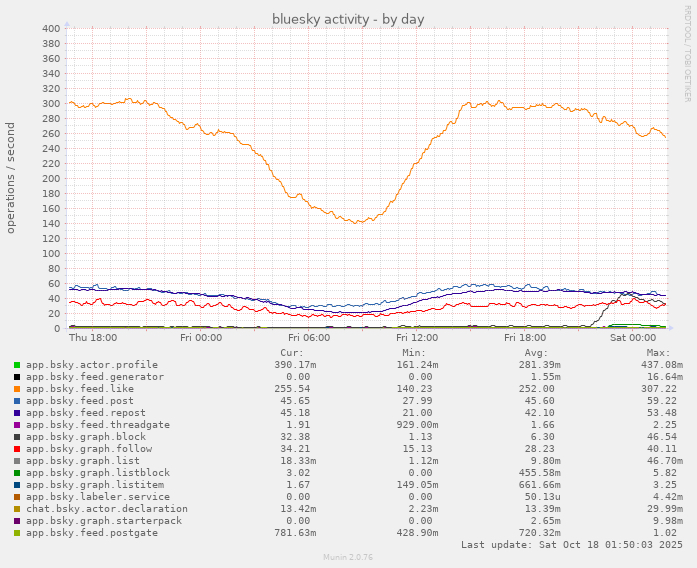 This is a chart of different types of Bluesky records being made per second. The gray line that suddenly rises from 0 to go above red (follows) and to equal blue (posts) and violet (reposts) is blocks (guess why) π«