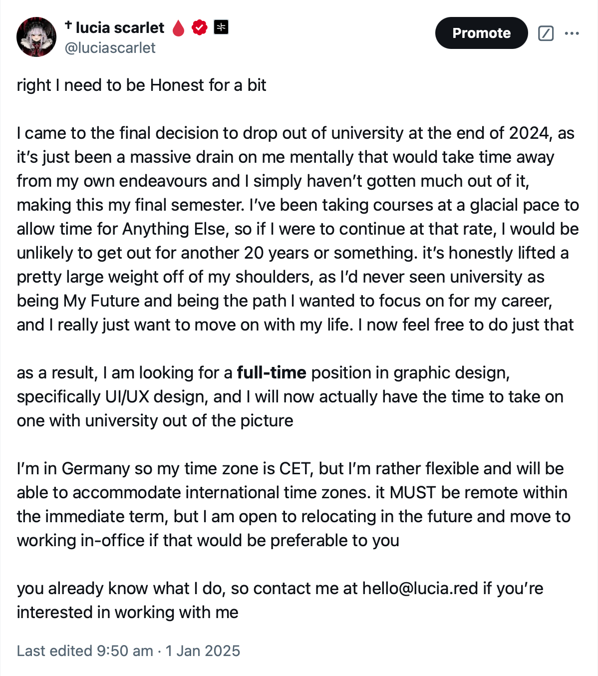 ✢ listless vampire ✧ people dni ✧ visual designer ✧ producer @voltra.io ✧ 𝕏 @luciascarlet @voltra ✧ pfp @ougiikun.[bsky.social](http://bsky.social ) ✧ hello@lucia.red ✢