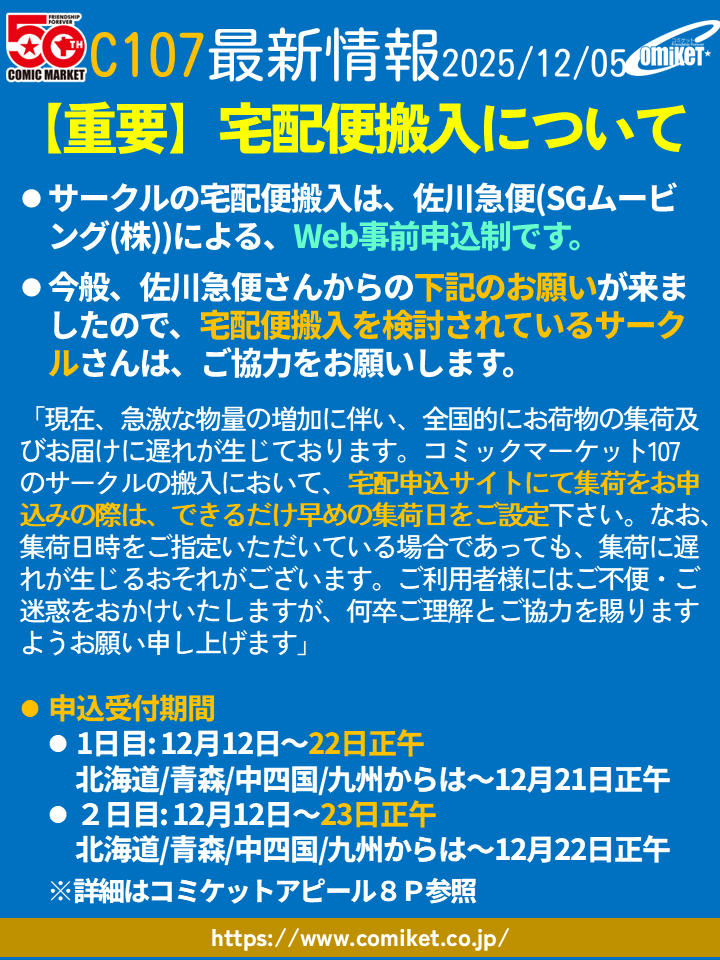 変 1 month ago 公式からもそう案内が出てた X (formerly Twitter)コミックマーケット準備会 (@comiketofficial) on X【重要!!宅配便搬入について】 ○今般、佐川急便さんからのご時世柄の下記お願いが来ましたので、宅配便搬...
