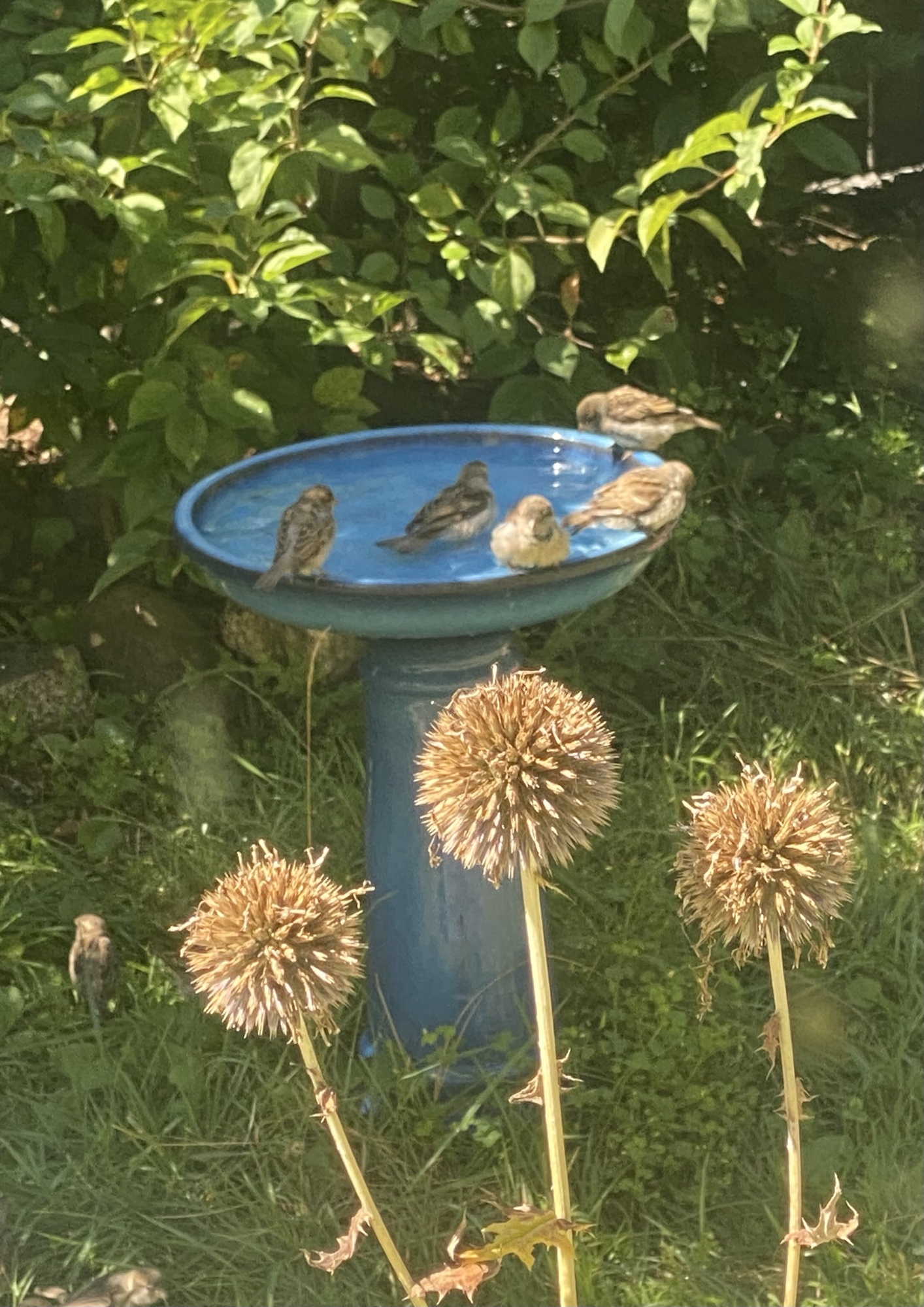 Young sparrows experimenting with the bird bath. Everyone in the pool! Picture taken by @gavingrant.bsky.social