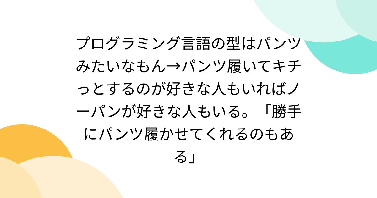 mattn 2 weeks ago たまたま自分の過去の発言を見付けて「この人、何言ってるの?」になった。 posfieプログラミング言語の型はパンツみたいなもん→パンツ履いてキチっとするのが好きな人もいればノーパンが好きな人もいる。「勝手にパンツ履かせてくれるのもある」パンツの履き方がわからない派です