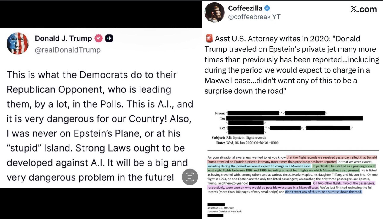 AUSA: “Trump traveled on Epstein’s private jet many more times than previously reported, including during the Maxwell charging period”