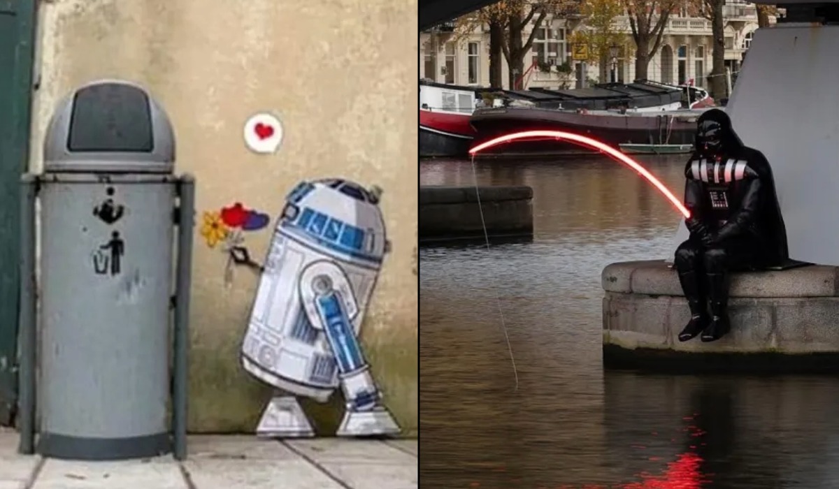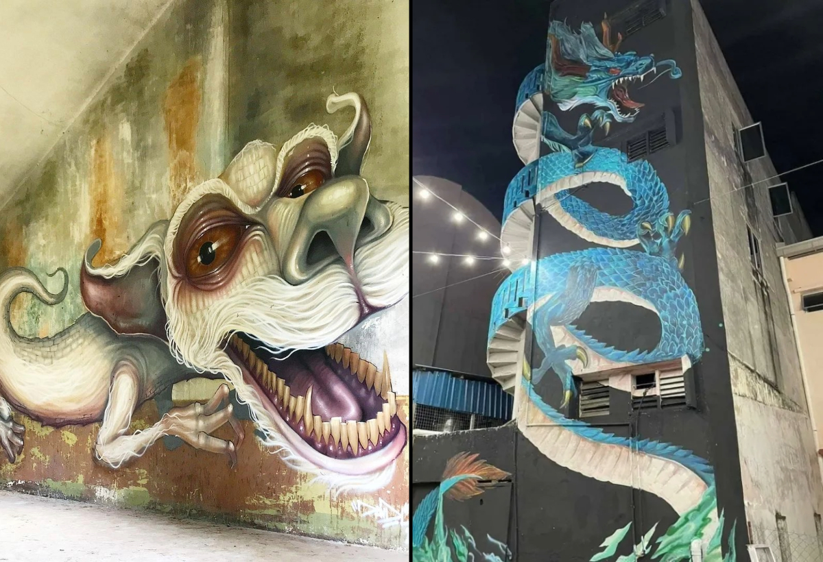 A three-story dragon coils around a spiral staircase, appearing to slither across the building’s surface. The detailed scales and vivid blues contrast with the black wall, giving this mural an almost cinematic presence. The mural is part of Project 06 at Kuantan Art Street in Pahang.