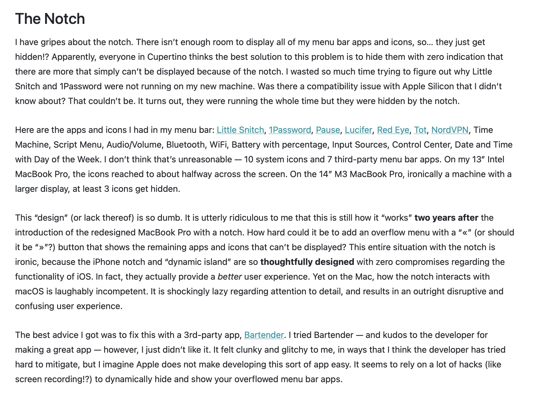 Wait, soβ¦ menu bar icons that overflow into the notch justβ¦ get eaten by the notch?! I thought they would get pushed to the other side behind itβ¦ so *that's* why the 1Password one isn't there π