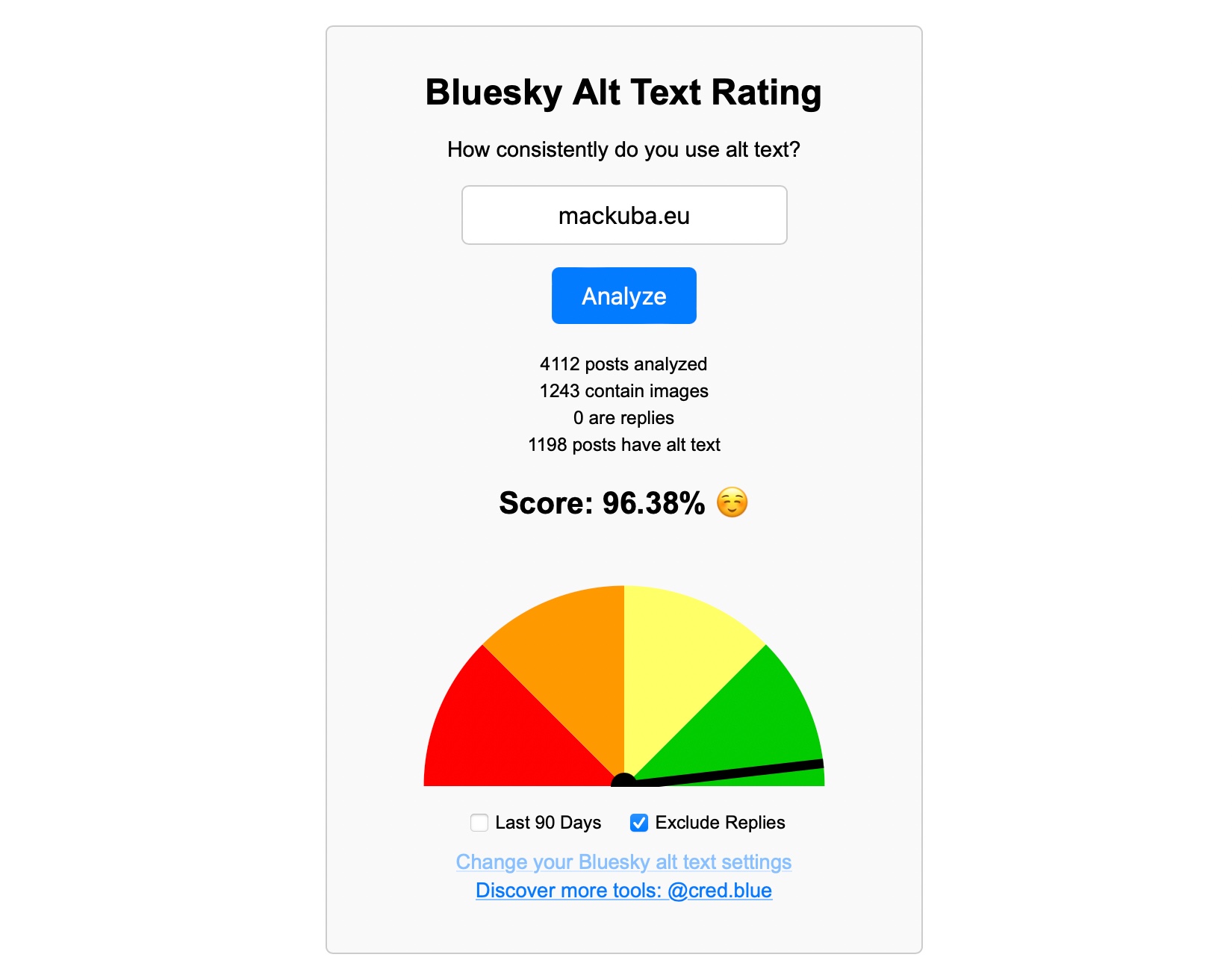 Kuba Suder π΅π±πΊπ¦ 11 months ago βΊοΈ [dame.is/ratingalttext](cred.blueGenerate a Bluesky score. Understand your AT Proto data footprint. Vibe check strangers and new accounts. ) Please use alt text, folks! https://lab.martianbase.net/xrpc/com.atproto.sync.getBlob?did=did:plc:oio4hkxaop4ao4wz2pp3f4cr&cid=bafkreiatebf6qjxejqhqdy3kietypcoz2z6lfdlbfw7asmvj6bne4xbtxi