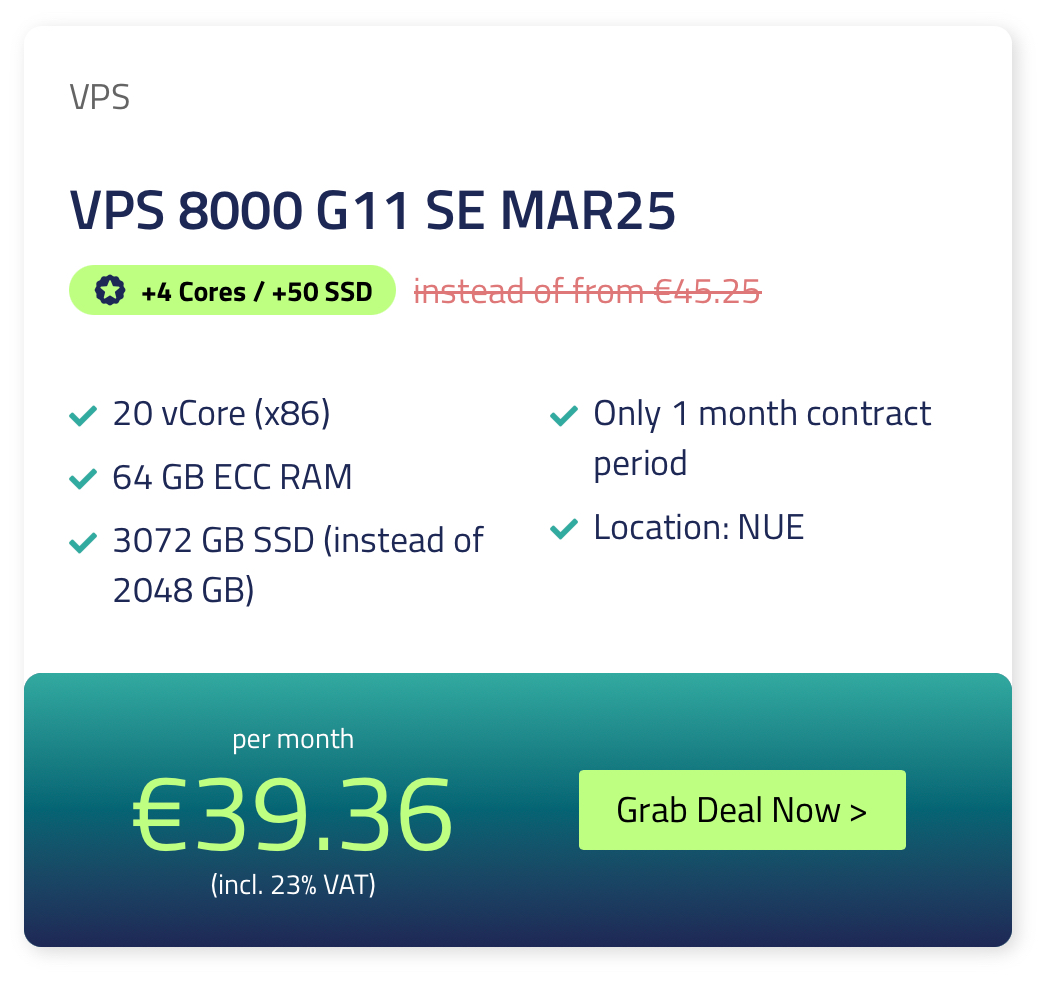 If anyone's interested, Netcup has a 24h flash deal of a few VPSes - they have the VPS 1000 with double space (512) for ~7β¬: [www.netcup.com/en/deals](