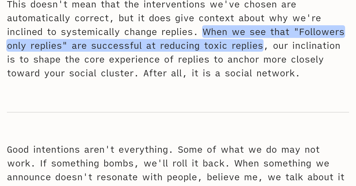 They're also very successful at reducing replies in general Β―\_(γ)_/Β― so of course, the fewer total replies there are, the fewer toxic replies we'll haveβ¦ But do we want a social network where everyone is just broadcasting into the void?β¦