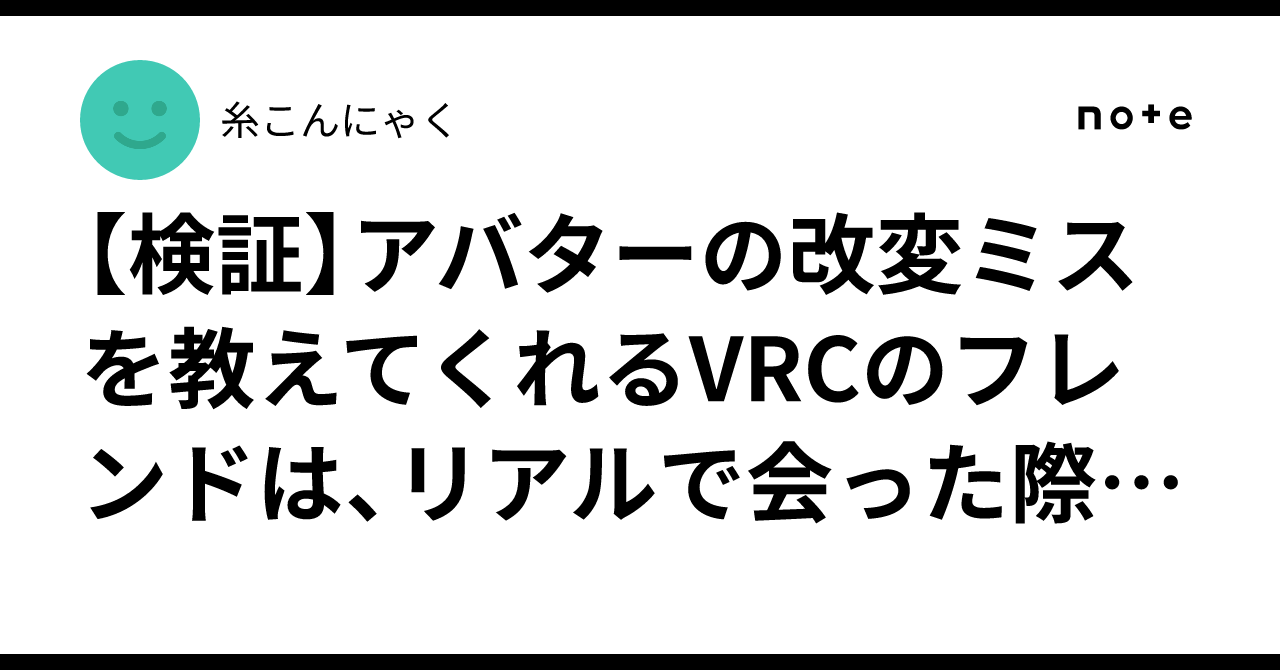 Horage:poke_type_ghost::poke_type_fairy: 4 days ago :meow_coffeespitting: note(ノート)【検証】アバターの改変ミスを教えてくれるVRCのフレンドは、リアルで会った際に鼻毛を出していても指摘してくれるのか?|こんにゃくさーてと!!! お仕事頑張ったし、今日も今日とてVR被りながらだらだらネットサーフィンして人生の貴重...