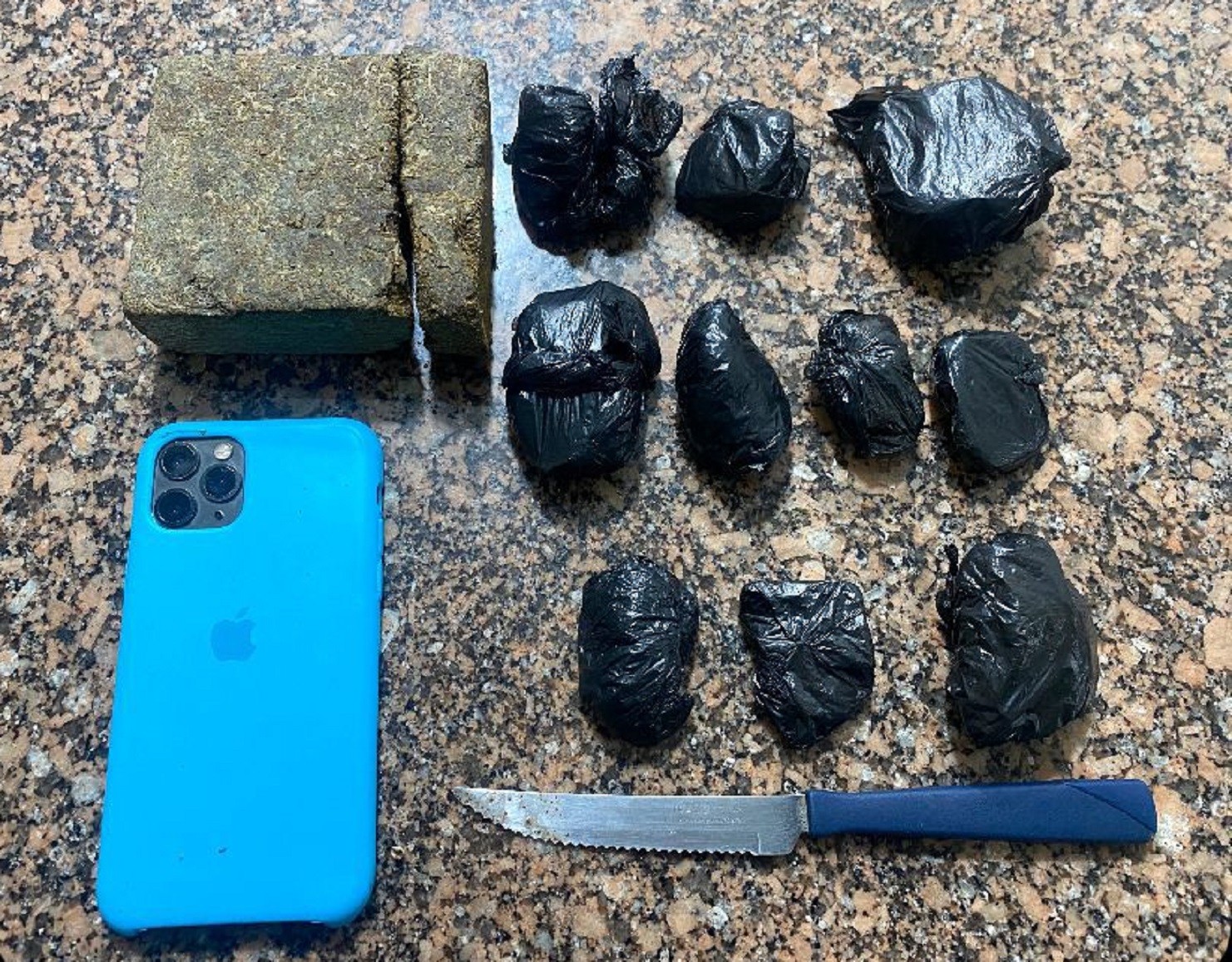 Diante da denúncia, os policiais intensificaram o patrulhamento na região e, ao visualizar o jovem no quintal de sua residência, flagraram-no fracionando um tijolo de maconha com uma faca.