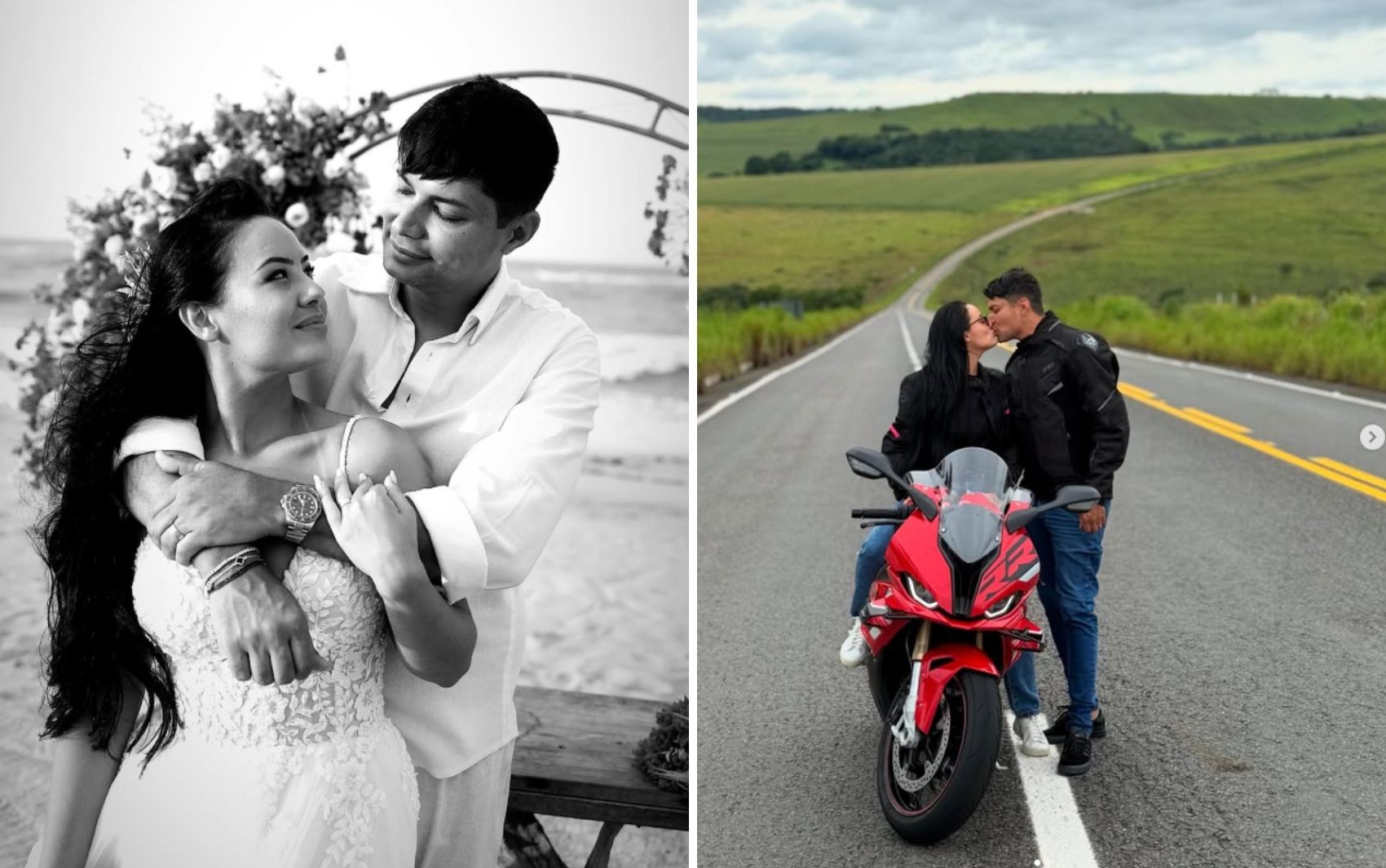 Thalyne e Alex no casamento e andando juntos de moto