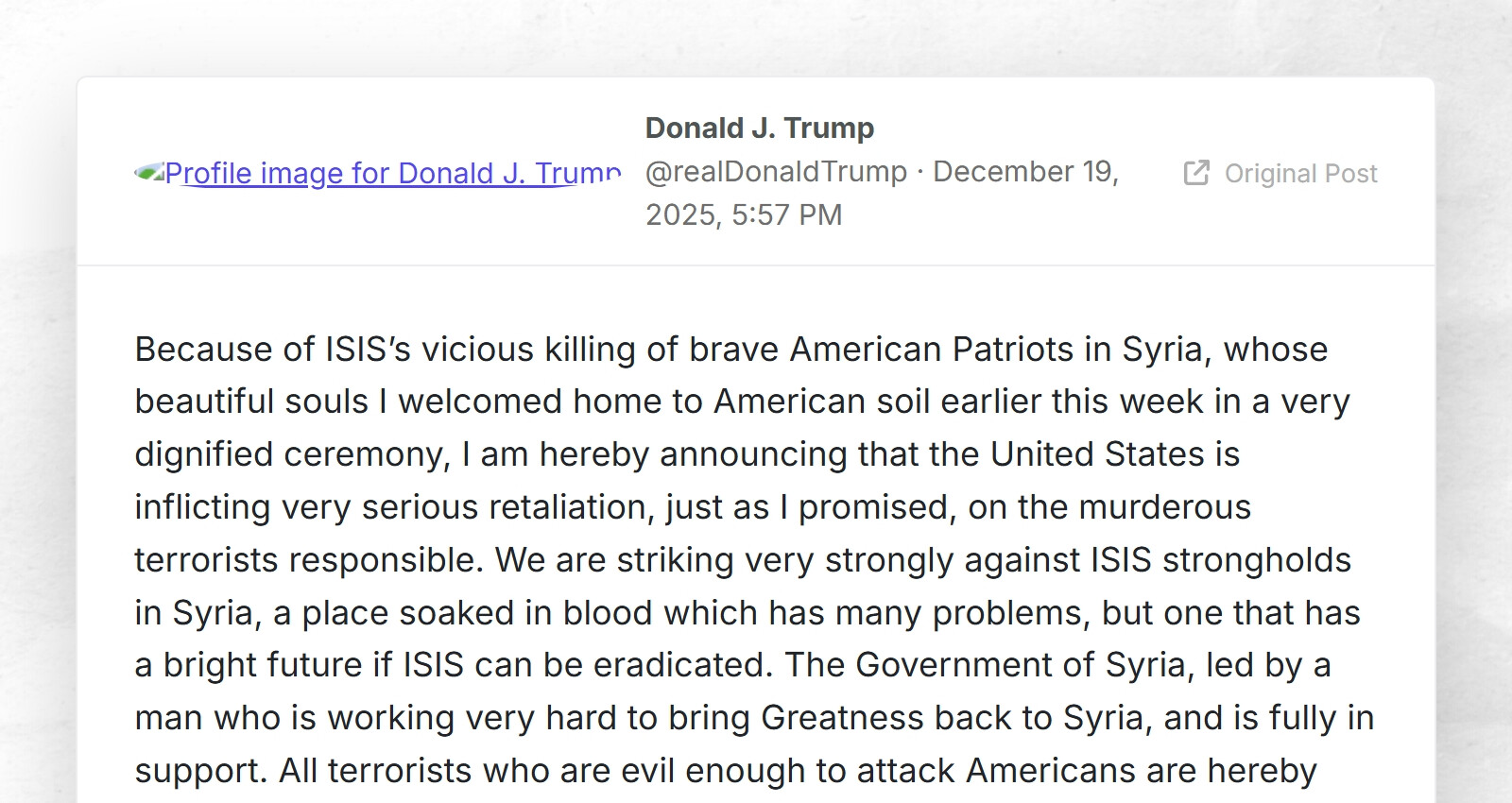 Because of ISIS’s vicious killing of brave American Patriots in Syria, whose beautiful souls I welcomed home to American soil earlier this week in a very dignified ceremony, I am hereby announcing that the United States is inflicting very serious retaliation, just as I promised, on the murderous terrorists responsible. We are striking very strongly against ISIS strongholds in Syria, a place soaked in blood which has many problems, but one that has a bright future if ISIS can be eradicated. The Government of Syria, led by a man who is working very hard to bring Greatness back to Syria, and is fully in support. All terrorists who are evil enough to attack Americans are hereby warned — YOU WILL BE HIT HARDER THAN YOU HAVE EVER BEEN HIT BEFORE IF YOU, IN ANY WAY, ATTACK OR THREATEN THE U.S.A. DONALD J. TRUMPPRESIDENT OF THE UNITED STATES OF AMERICA
