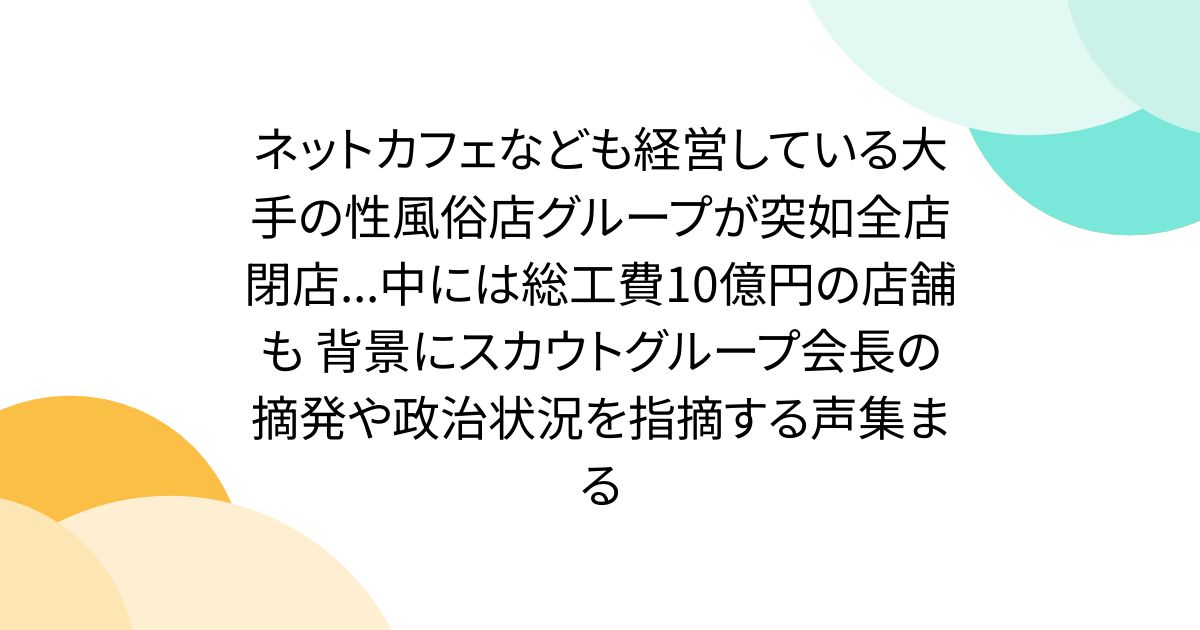 しおん / shion 3 days ago なんとなく、もしかして?と思って読んでみたら、やはり廃墟好きには「クイーンシャトー」として知られていた水戸の高級ソープ廃墟を近年リニューアル開店させたグループっぽいなー。 また廃墟になってしまうのかしら。 Togetter [トゥギャッター]ネットカフェなども経営している大手の性風俗店グループが突如全店閉店...中には総工費10億円の店舗も 背景にスカウトグループ会長の摘発や政治状況を指摘する声集まる大手性風俗店グループ「マリン」が全店舗閉店。従業員や常連が移籍先を探し混乱、週末の客足や地域経済に...