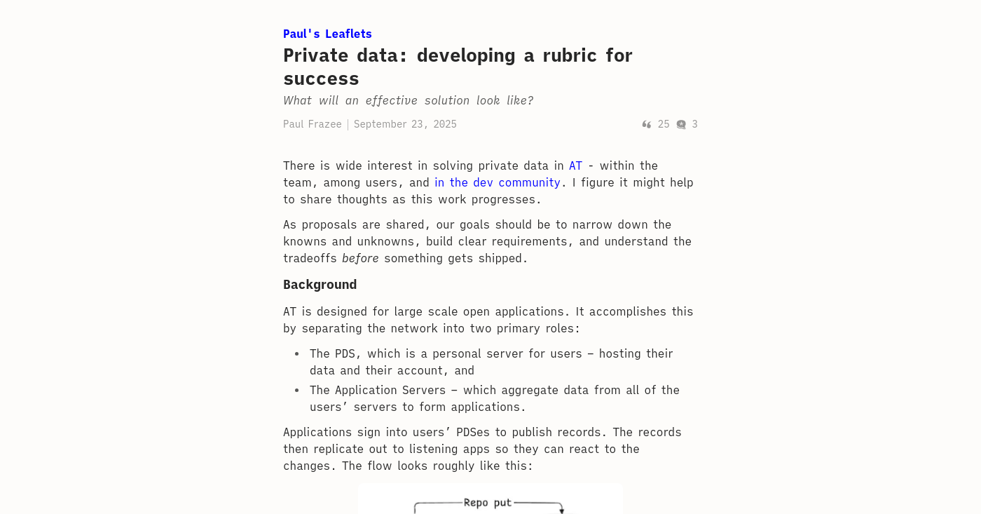 Paul Frazee 3 months ago Some initial thoughts on the requirements for AT's private data model [Private data: developing a rub...](Private data: developing a rubric for success - Paul's LeafletsWhat will an effective solution look like? )