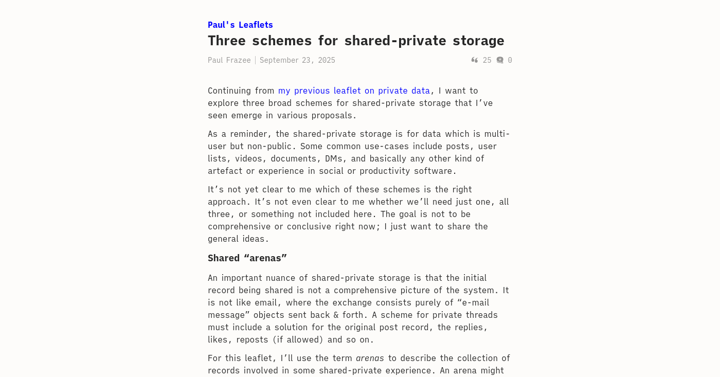 Paul Frazee 3 months ago Surprise! A second leaflet on private data in AT, this time exploring some schemes that might be used to implement shared-private data. [Three schemes for shared-priva...](Three schemes for shared-private storage - Paul's Leaflets )