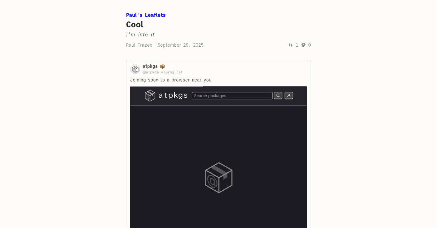 Paul Frazee 3 months ago Watching some of the open source package distribution governance issues playing out has me increasingly inclined towards the value of publishing packages via AT repos and reducing the package managers to replaceable app servers (appviews)