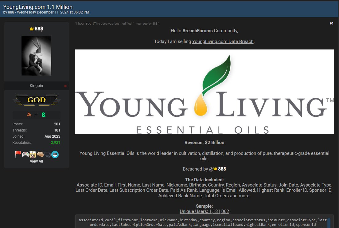 New breach: Young Living Essential Oils had 1.1M unique email addresses breached and advertised on a hacking forum this month. Data included name, country and DoB. 78% were already in @npub1rqsm...83hv. Read more: