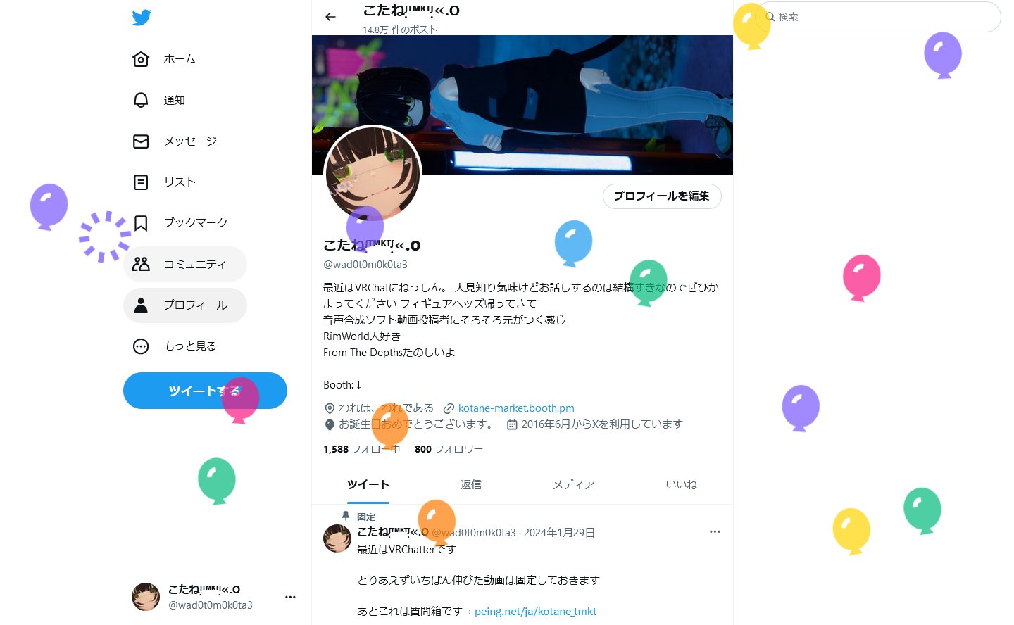 こたね 3 months ago X (formerly Twitter)こたねᶴ᳝ᵀᴹᴷᵀᶴ᳝͏≪.O (@wad0t0m0k0ta3) on Xみんなおとといはありがと~~~~~! TwitterとかDiscordとかで祝ってくれたひとも! 今年はしあわせな誕生... X (formerly Twitter)こたねᶴ᳝ᵀᴹᴷᵀᶴ᳝͏≪.O (@wad0t0m0k0ta3) on Xきょうはお誕生日なのです 京町セイカさん歳になりました