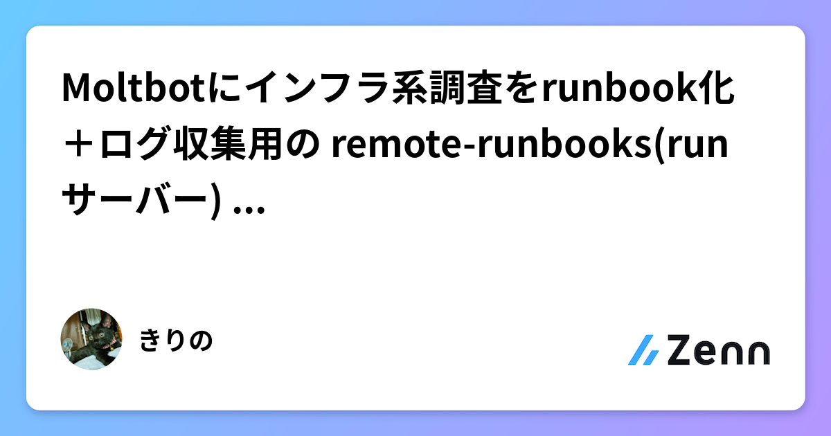 きりの 4 days ago ブログ書いたよ。→ Moltbotにインフラ系調査をrunbook化+ログ収集用の remote-runbooks(runサーバー) を作らせた|きりの ZennMoltbotにインフラ系調査をrunbook化+ログ収集用の remote-runbooks(runサーバー) を作らせた #zenn