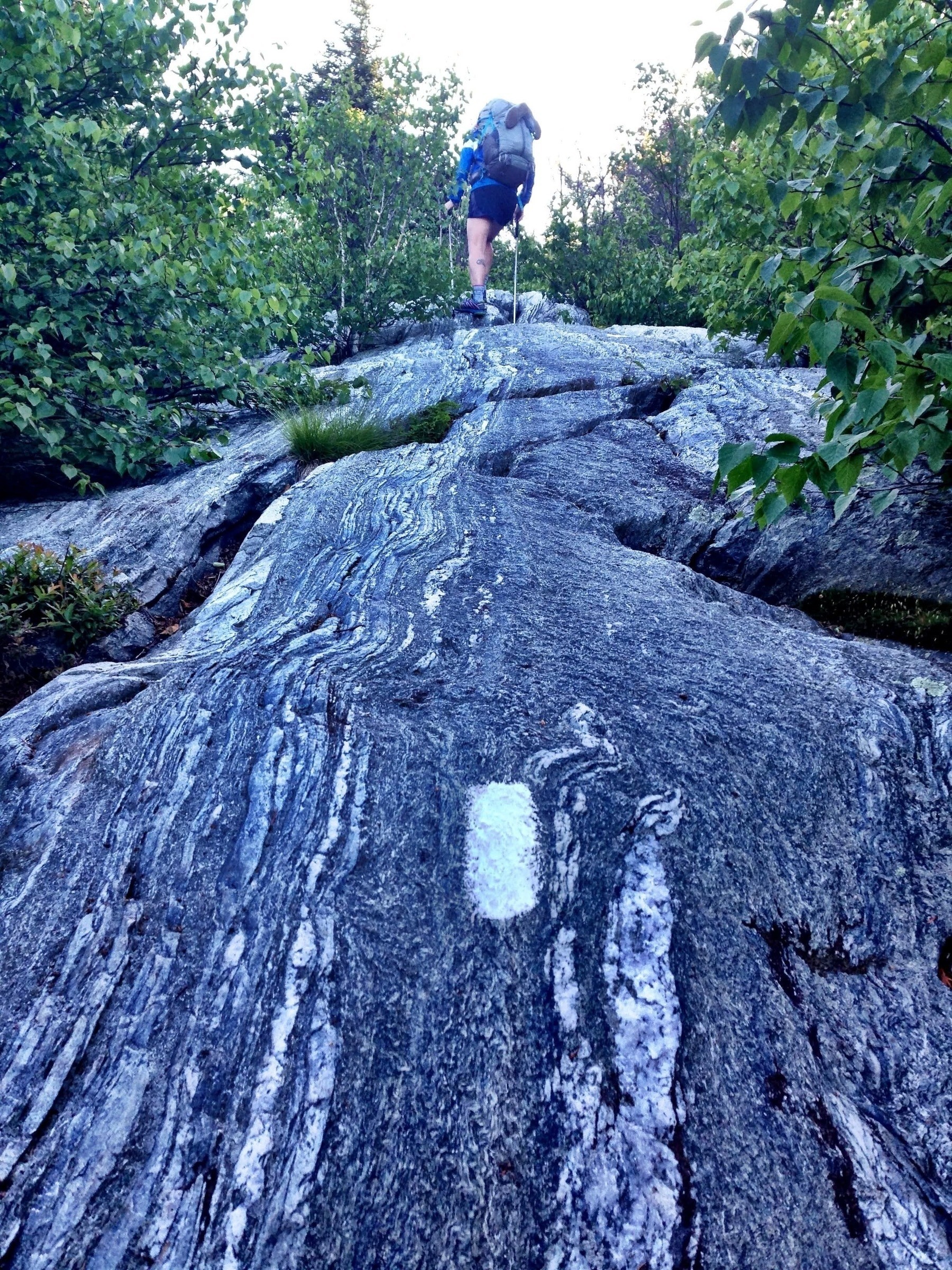 In the south, the #AppalachianTrail has lots of switchbacks and long, long gradual climbs out of gaps. In New England, you get stuff like this Vermont scene - straight up mountains on bare granite. On the steeper climbs, all the tree bark is worn off whereever hikers can grab for support. #hiking - https:/... social.lol