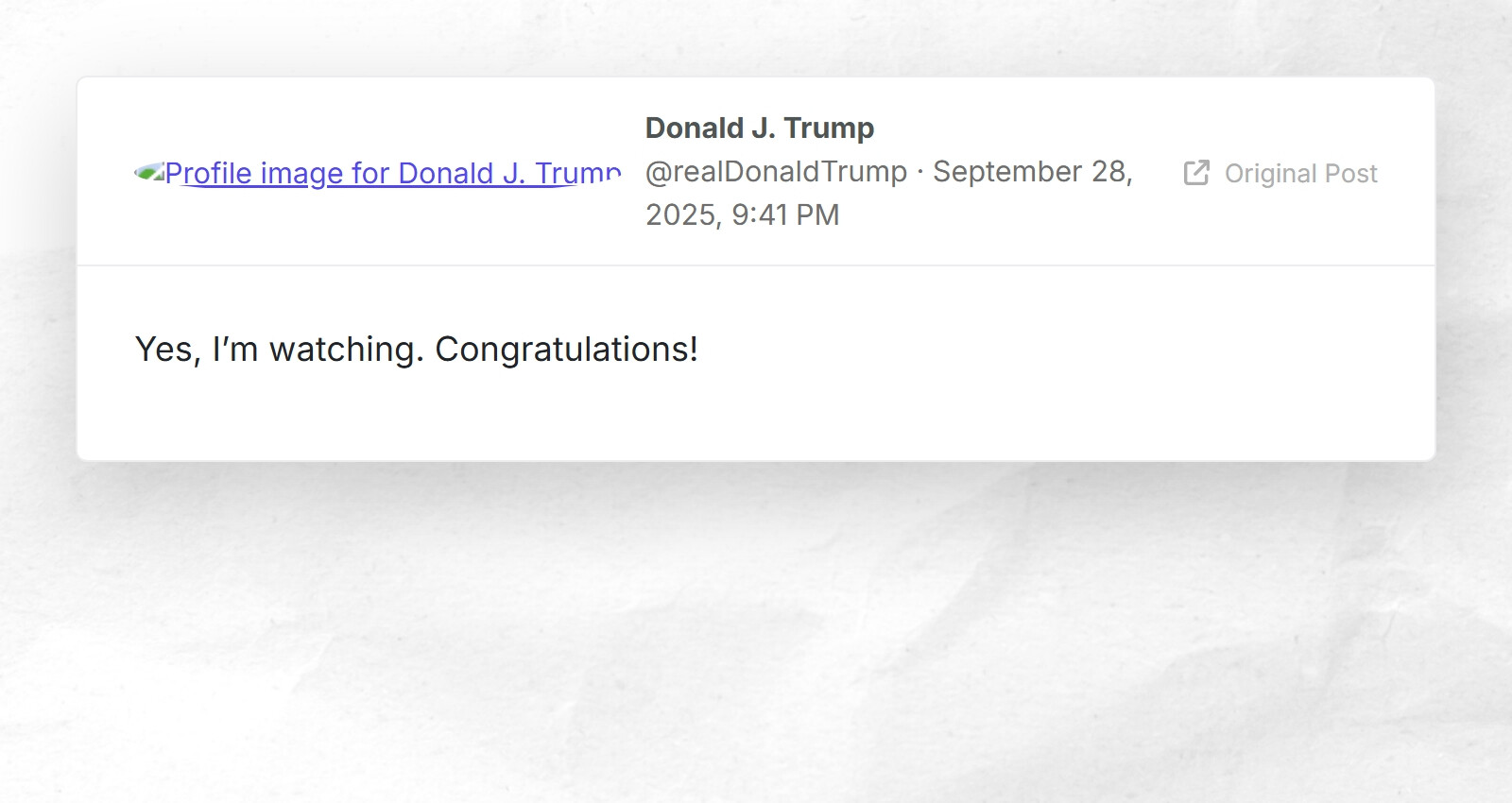 Donald J. Trump: "Yes, I’m watching. Congratulations!"