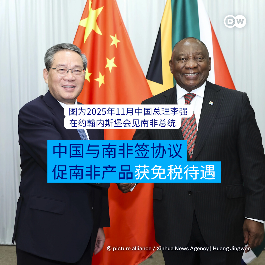 #德国之声中文 中国和南非签署了一项新的贸易框架协议。此前,由于美国对南非征收高额关税,以及与特朗普政府的外交关系破裂,非洲最大的经济体南非正在寻求其他伙伴关系。 针对与中国的框架性经济伙伴关系协议,南非方面称,这是推动南非产品免税进入中国市场的重要一步。 南非贸易和工业部表示,该协议将启动一项谈判,旨在使部分南非商品(例如水果)免税进入中国市场。该部预计,这项贸易协议将于3月底前最终敲定。作为交换,中国将在南非获得更多投资机会。 根据特朗普总统的对等关税政策,美国对部分南非商品加征了30%的关税——这是全球最高的关税税率之一。南非表示仍在与美国谈判,以期达成更有利的协议。 中国已经是南非最大的贸易伙伴,而美国是南非的第二大贸易伙伴。同时,中国在非洲大陆的经济影响力持续增长,并在非洲关键矿产的开采中占据主导地位,而这些矿产是新型高科技产品的关键组成部分。 南非对中国出口额最大的商品是黄金、铁矿石和铂族金属,而中国汽车在南非的市场份额也迅速增长。行业组织估计,中国汽车品牌在南非市场的份额已从2020年的约2.8%增长到去年的11%至15%。 南非贸易部表示:“南非期待以友好、务实和灵活的方式与中国开展合作。”贸易和工业部长帕克斯·陶(Parks Tau)前往中国签署了该协议。他表示,该协议将惠及南非的采矿、农业、可再生能源和科技行业。 特朗普政府指责南非奉行反美外交政策,并放任国内白人少数族裔遭受暴力迫害,导致双边外交关系跌至数十年来的最低谷。 南非政府否认了有关阿非利卡人(白人)农民遭到杀害、土地被大规模掠夺的指控,称其毫无根据。 特朗普还将南非排除在今年在美国举行的二十国集团(G20)会议之外。 (消息来源:美联社、路透社) ![](https://pbs.twimg.com/media/HAe-qpDWoAAb2k7?format=jpg&name=orig)
